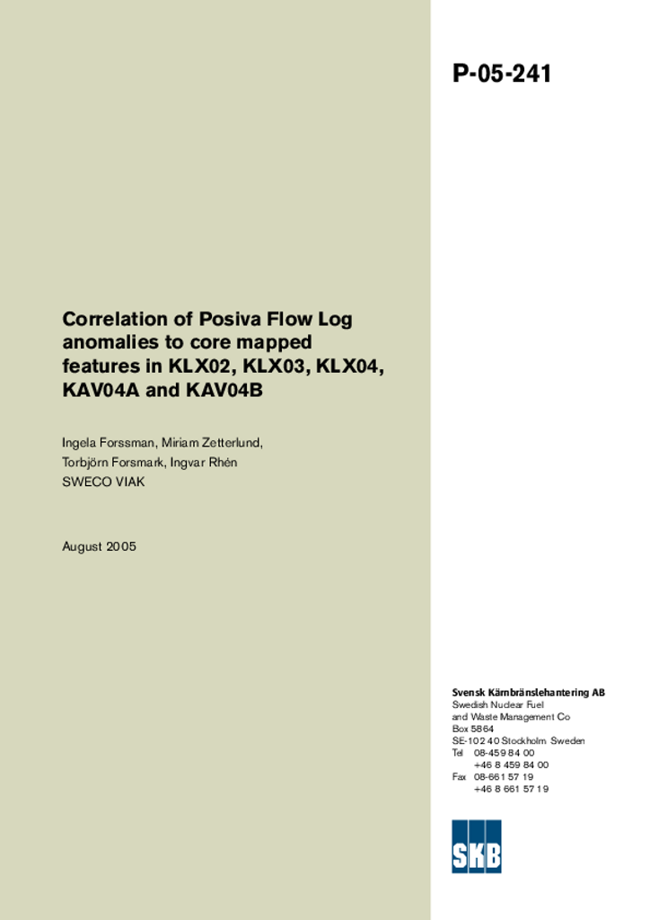 Correlation of Posiva Flow Log anomalies to core mapped features in KLX02, KLX03, KLX04, KAV04A and KAV04B