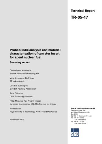 Probabilistic analysis and material characterisation of canister insert for spent nuclear fuel. Summary report