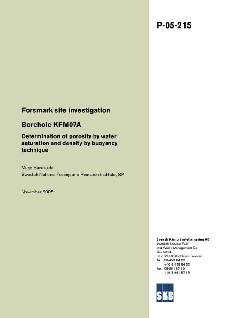 Forsmark site investigation. Borehole KFM07A. Determination of porosity by water saturation and density by buoyancy technique