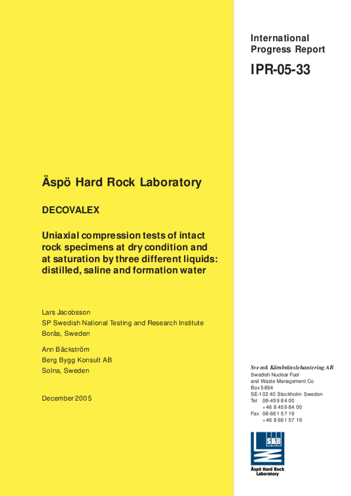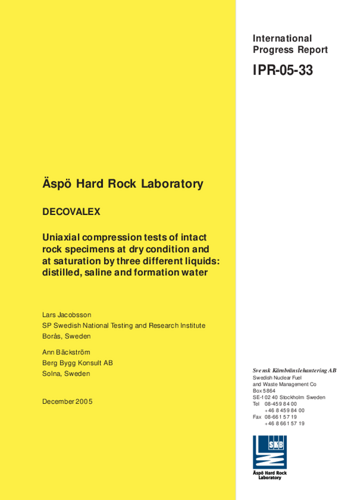 DECOVALEX. Uniaxial compression tests of intact rock specimens at dry condition and at saturation by three different liquids: distilled, saline and formation water