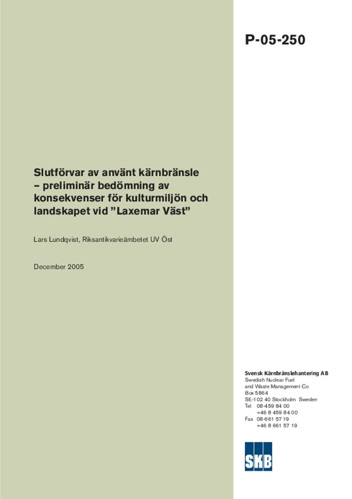 Slutförvar av använt kärnbränsle - preliminär bedömning av konsekvenser för kulturmiljön och landskapet vid "Laxemar Väst"