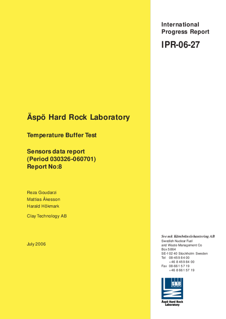 Äspö Hard Rock Laboratory. Temperature Buffer Test. Sensors data report (period 030326-060701) Report No:8