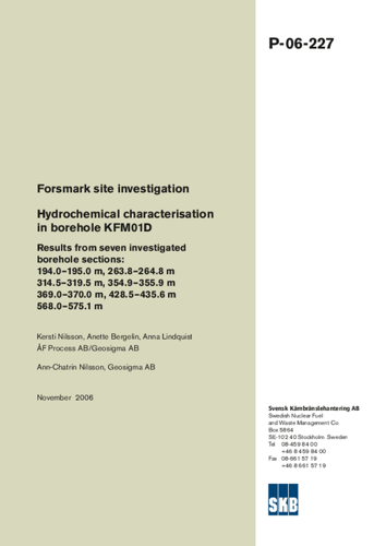 Forsmark site investigation. Hydrochemical characterisation in borehole KFM01D. Results from seven investigated borehole sections: 194.0-195.0 m, 263.8-264.8 m, 314.5-319.5 m, 354.9-355.9 m, 369.0-370.0 m, 428.5-435.6 m, 568.0-575.1 m