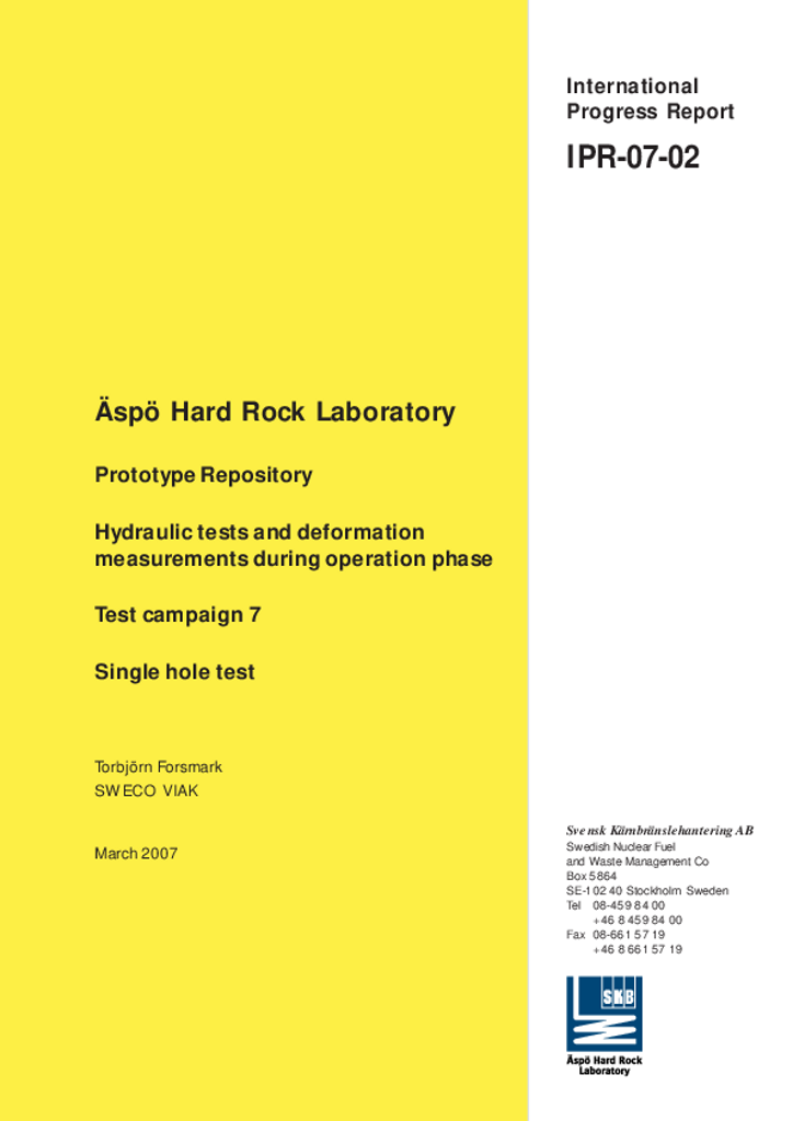 Äspö Hard Rock Laboratory. Prototype Repository. Hydraulic tests and deformation measurements during operation phase. Test campaign 7. Single hole test