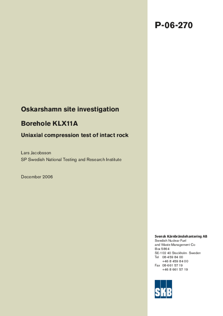 Oskarshamn site investigation. Borehole KLX11A. Uniaxial compression test of intact rock