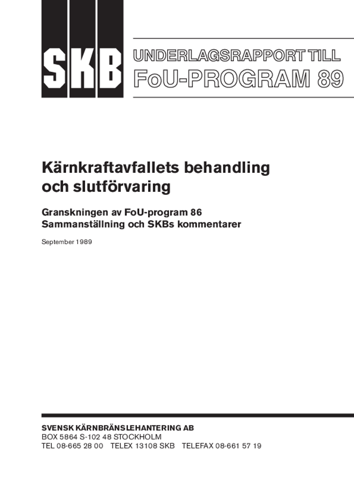 Underlagsrapport till FoU-program 89. Kärnkraftavfallets behandling och slutförvaring. Granskningen av FoU-program 86. Sammanställning och SKBs kommentarer