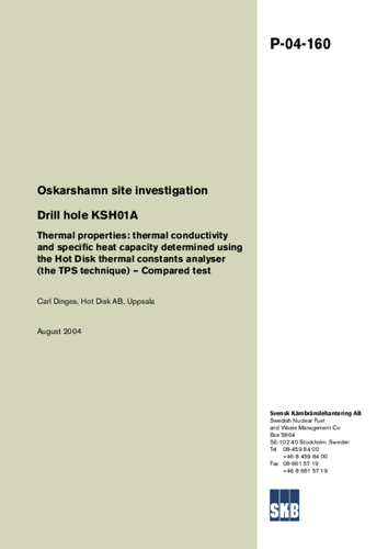 Oskarshamn site investigation. Drill hole KSH01A. Thermal properties: thermal conductivity and specific heat capacity determined using the Hot Disk thermal constants analyser (the TPS technique) - Compared test