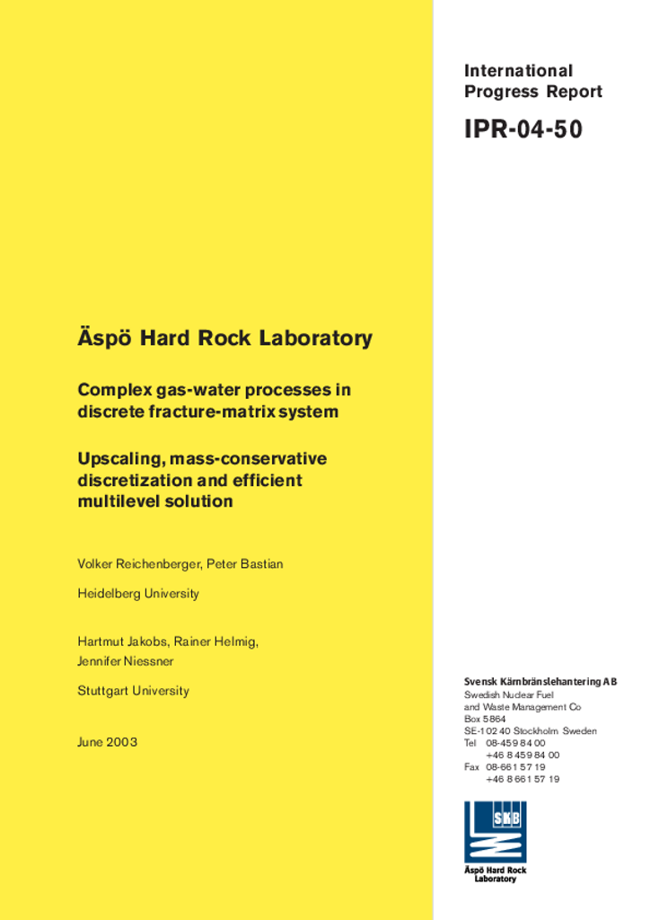 Äspö Hard Rock Laboratory. Complex gas-water processes in discrete fracture-matrix system. Upscaling, mass-conservative discretization and efficient multilevel solution