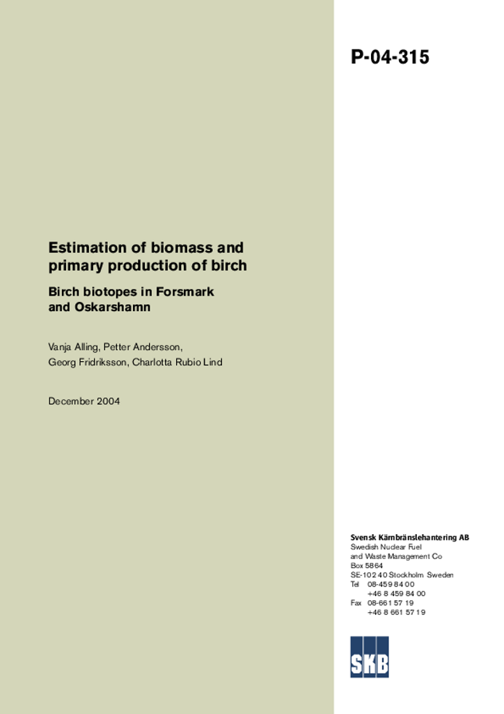 Estimation of biomass and primary production of birch. Birch biotopes in Forsmark and Oskarshamn