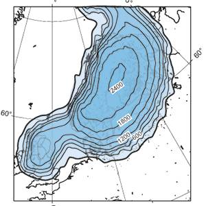 Simulerad utbredning och höjd för inlandsisen när den var som störst för omkring 18 000-20 000 år sedan.