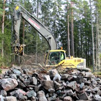 Grävskopa lägger grenar ovanpå en stenhög. Foto: Eva Nevelius