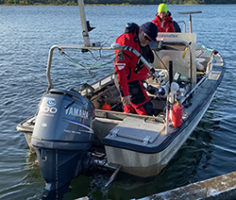Micke Borgiel och hans två kolleger från Sveriges Vattenekologer kastar loss för att börja dykningarna utanför Stora Asphällan. Foto: SKB.