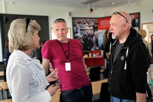 Martin Björnström och Eric Wallström pratar med Åsa Lindwall på personalenheten på SKB. Foto: Lasse Modin